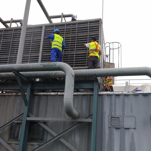 冷卻塔清理,由于冷卻塔暴露于大氣中,運(yùn)行過(guò)程中會(huì)有大量的泥沙、藻類(lèi)等附著于冷卻塔填料表面,不清理干凈會(huì)在以后的運(yùn)行中將這些污垢沖洗到冷卻器內(nèi)造成冷卻器內(nèi)熱交換銅管的堵塞,影響熱交換效果,所以必須對(duì)冷卻塔進(jìn)行徹底清理。